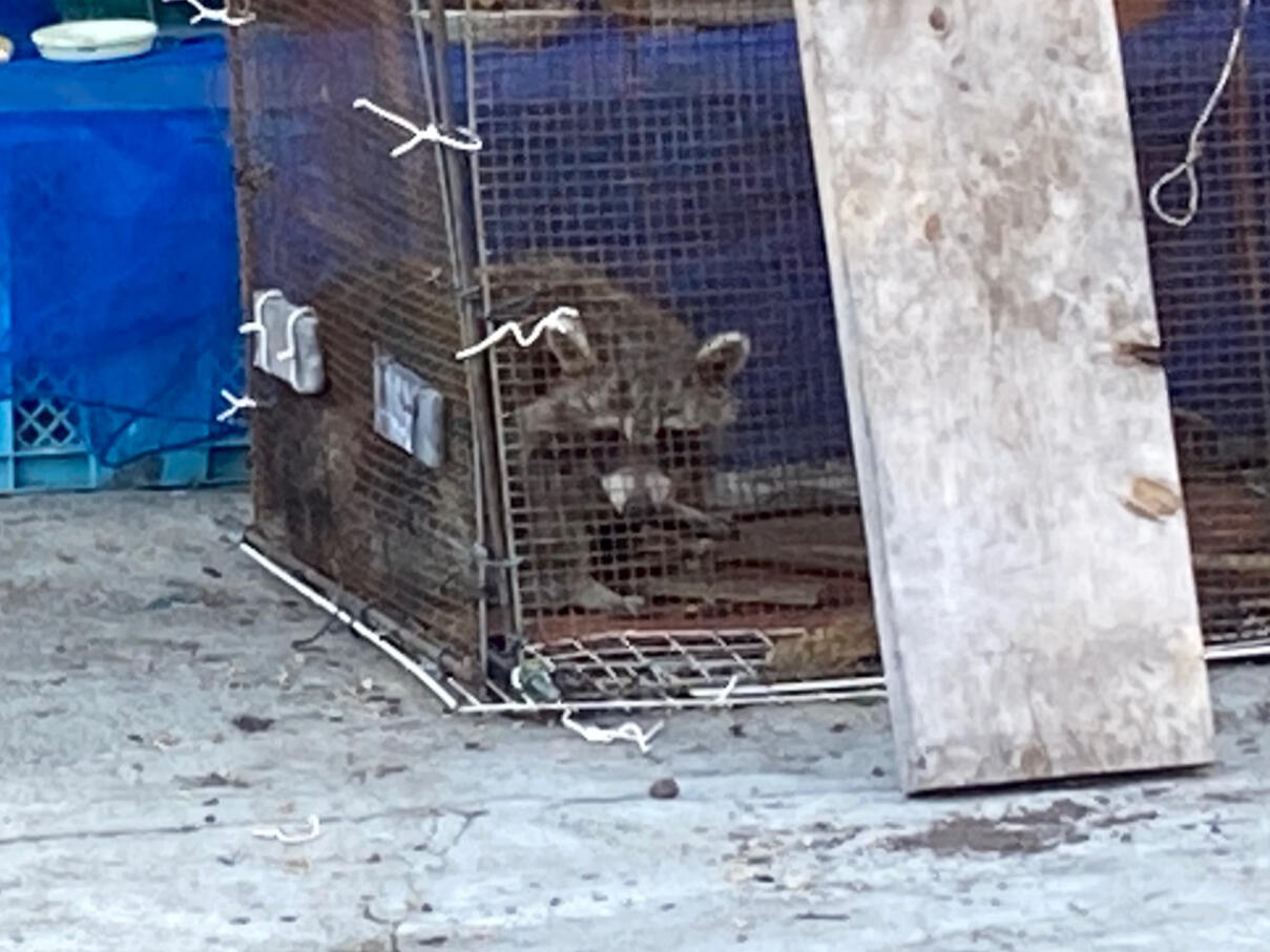 Rascal had been nibbling on the neighbour's flowers and so not knowing what it was that was eating his prize flowers (his bread and butter) from which he makes his living, he set a trap and that night he hit pay dirt. The next day Rascal was there (caged) for all to see. Urban legend had it that raccoons were residents in them darn Hokkaido woods, but until you actually see one, you remain justifiably skeptical.